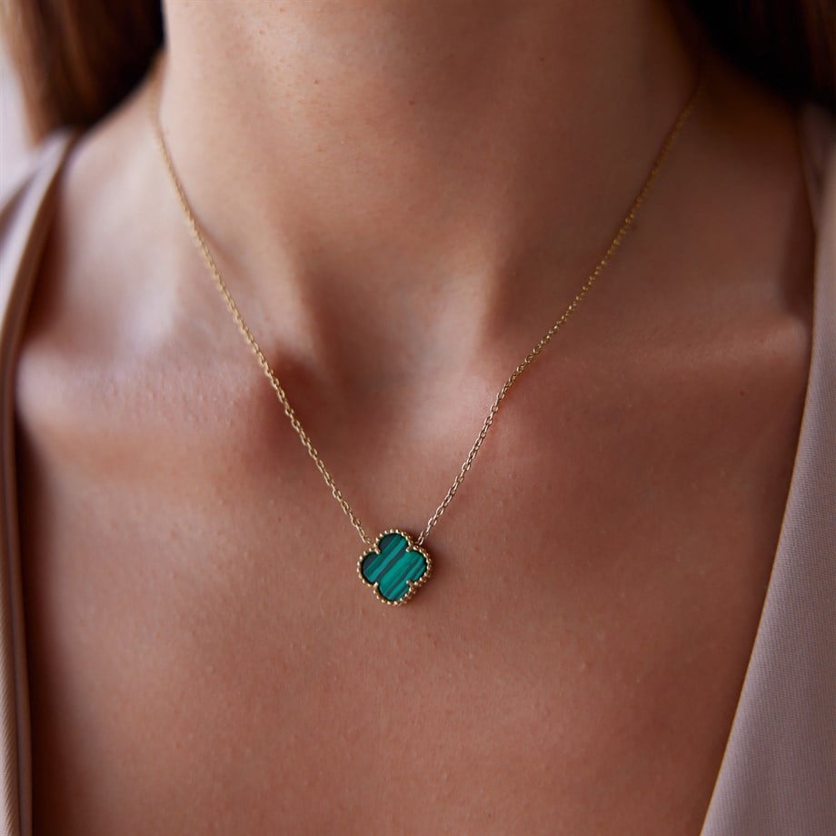 Yonca Model Yeşil Renk Paslanmaz Çelik Üzeri Altın Kaplama Kolye